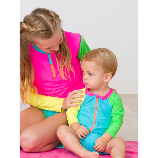 Tween Girls Neon Color Block Long Sleeve Zipper Rash Guard 2-Piece