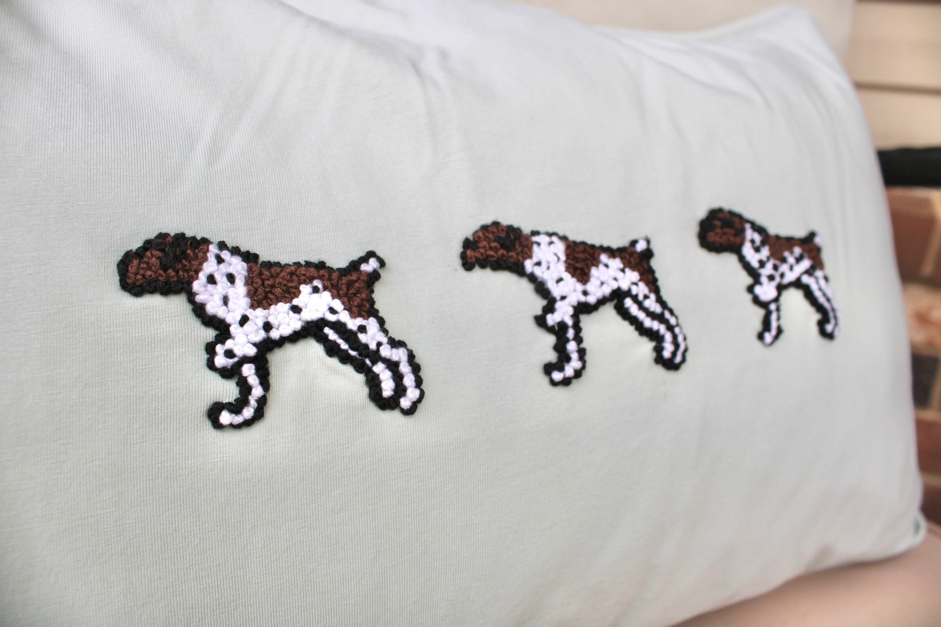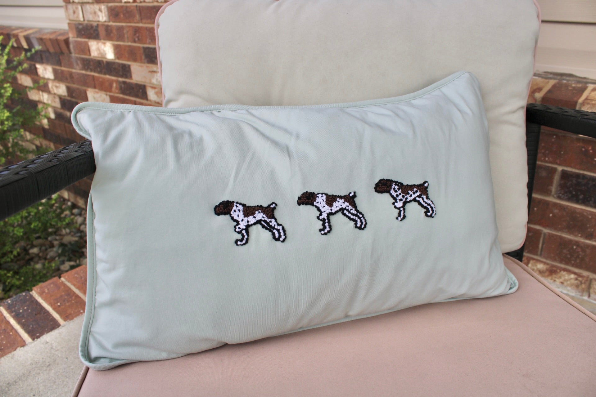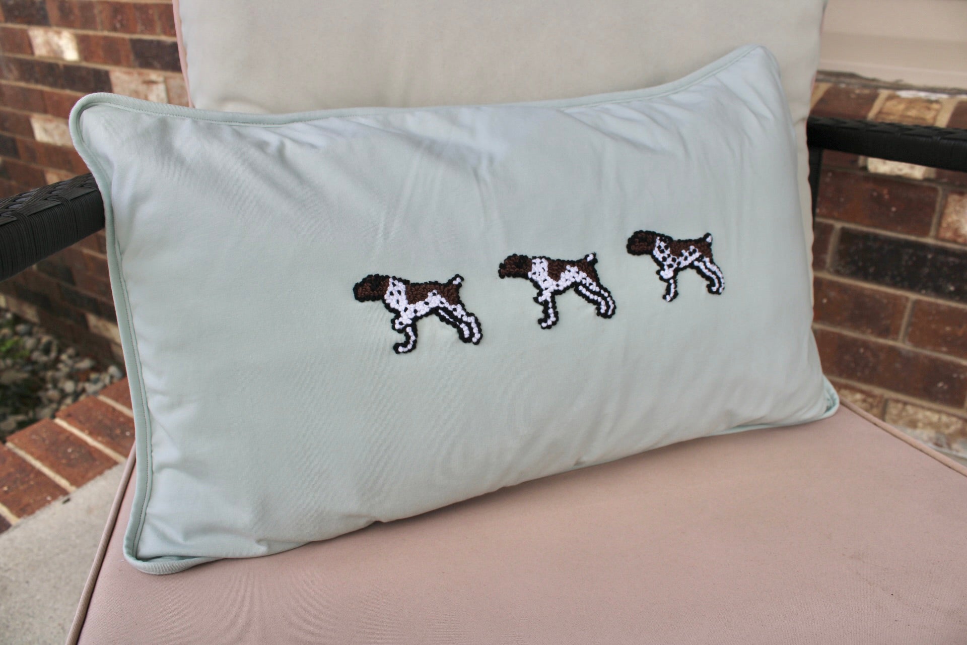 This is a preorder item with an ETA of April. 12 x 20" knit throw pillow case with french knot German shorthair pointer design. Prefilled with removable insert in a zipper enclosure.