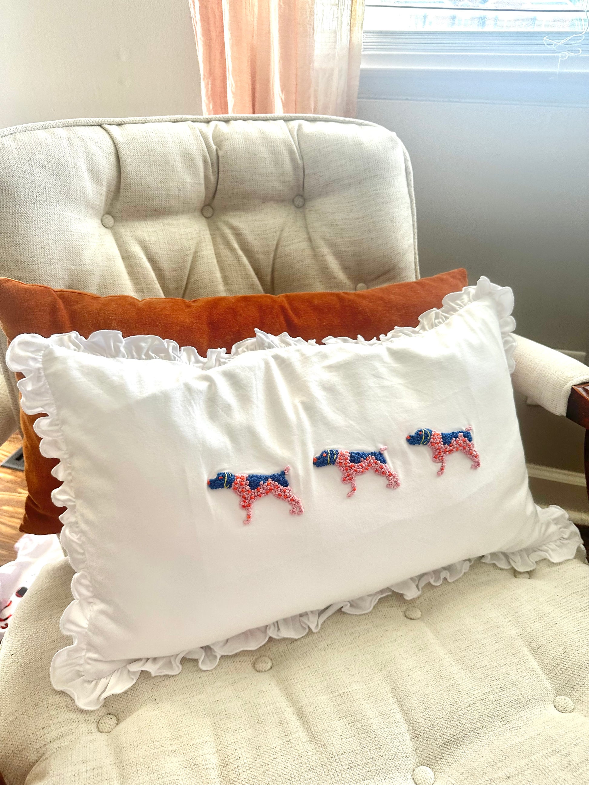 12 x 20” French knot by hand throw pillow. Prefilled with zipper enclosed insert. ETA late December