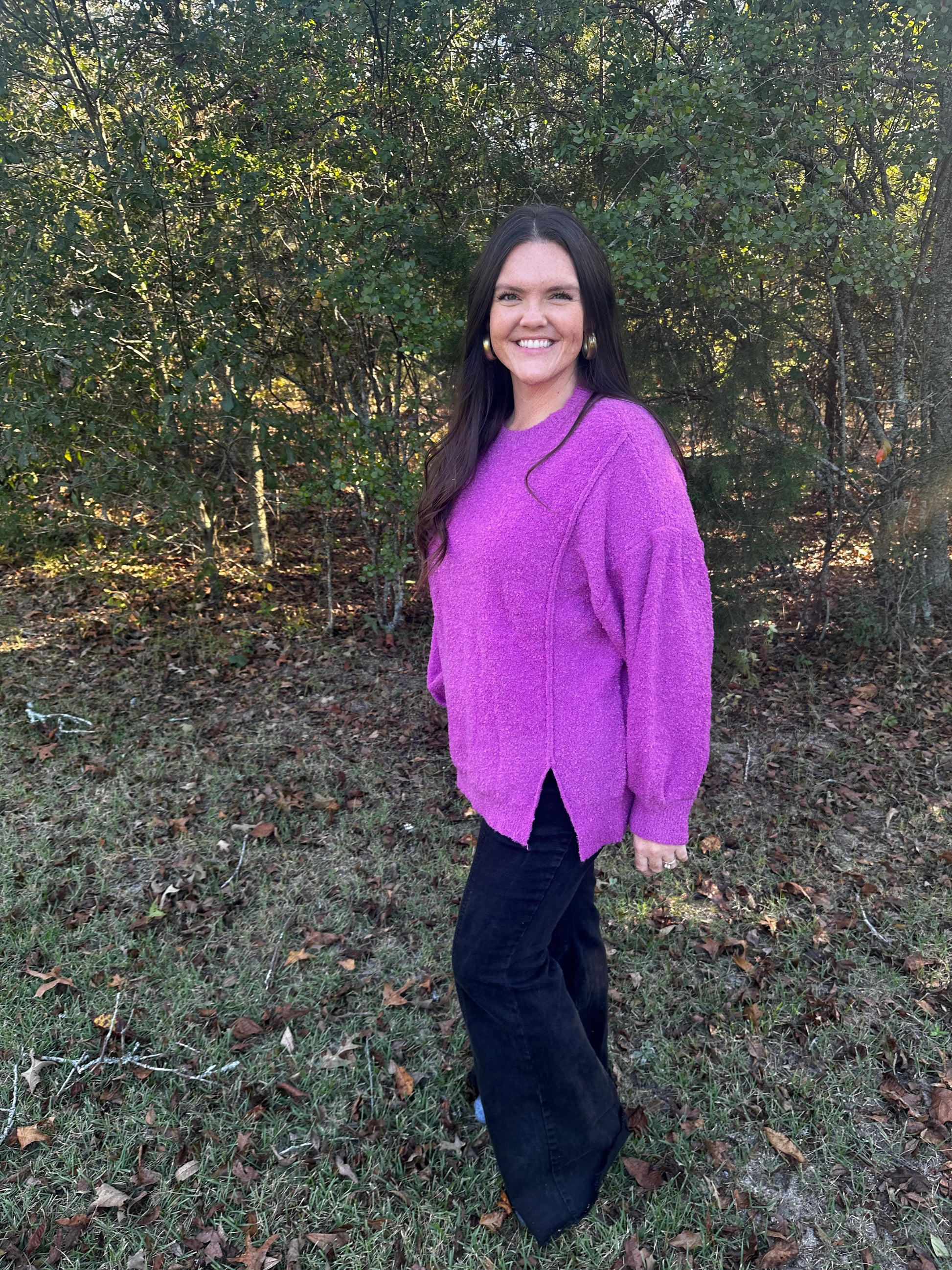 Very berry loose fit sweater with side slit detail and pintuck sleeves. This sweater runs very generous. Could easily be dressed up or worn with leggings. The model is wearing a size large with room