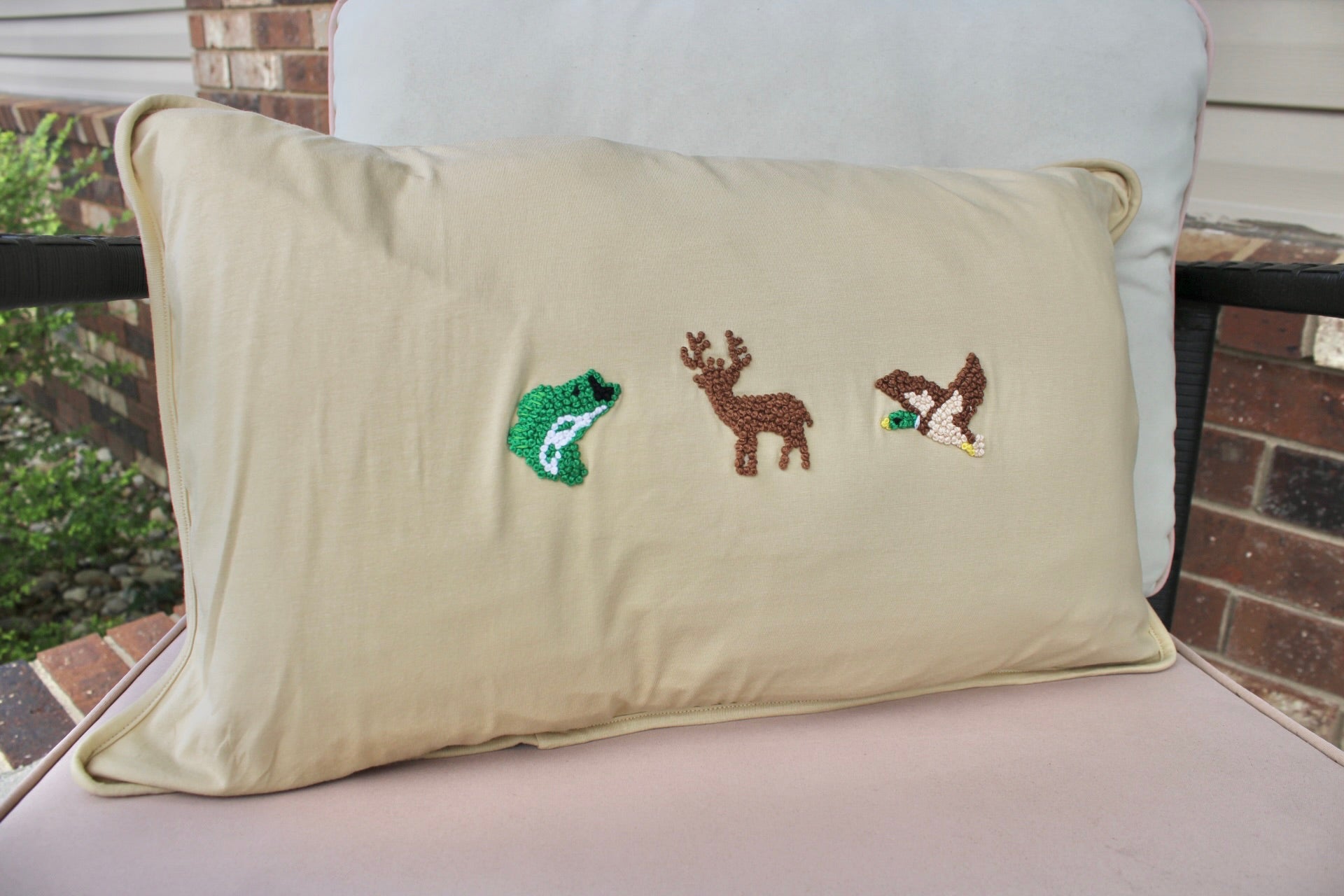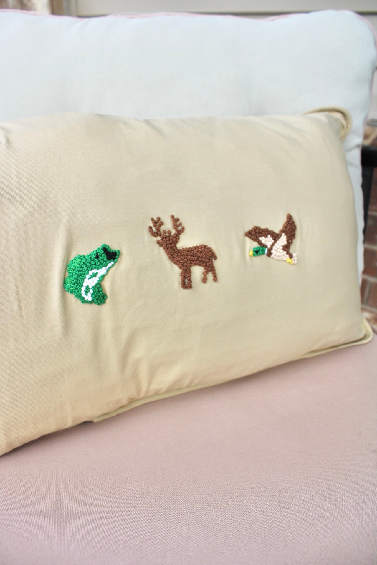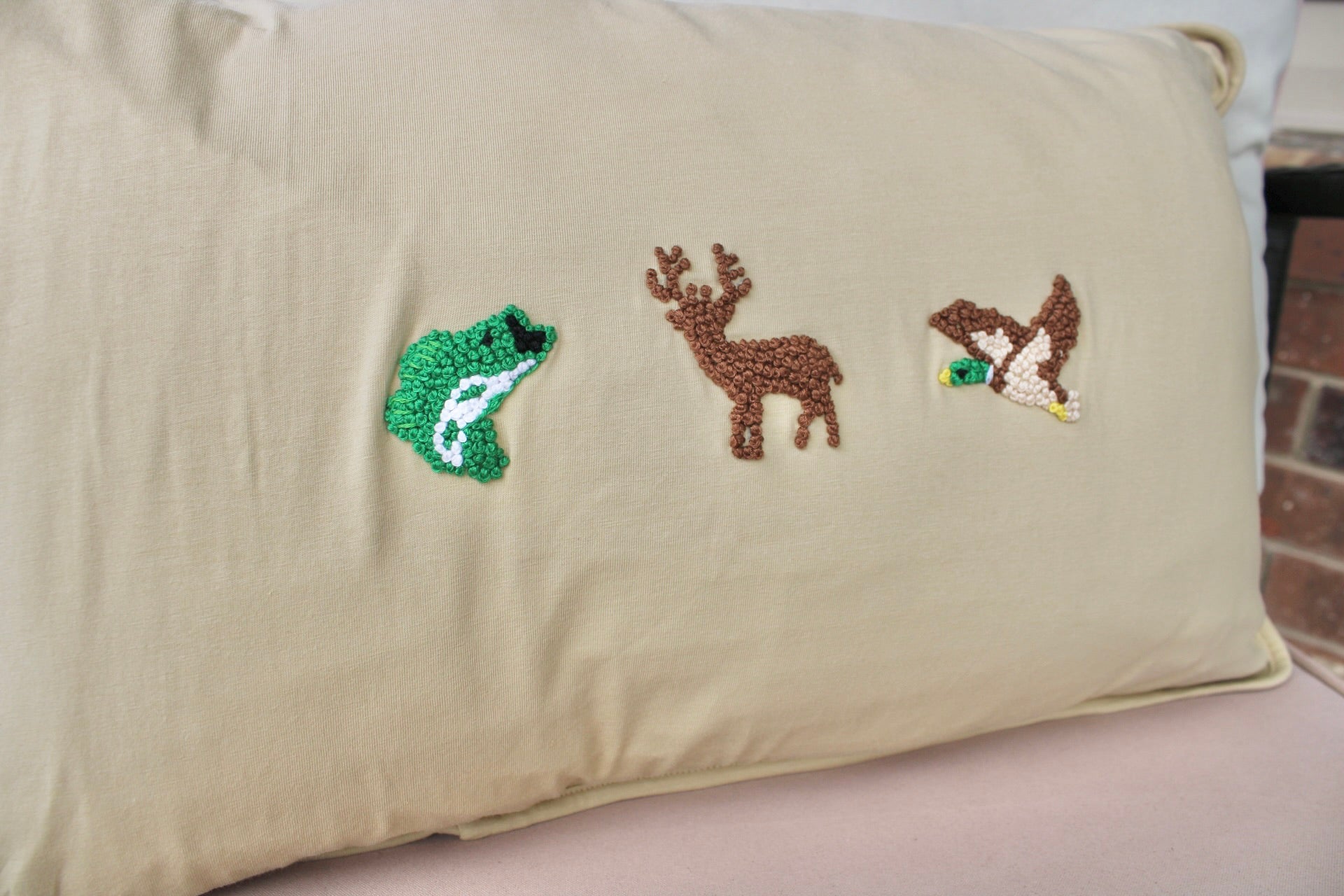 12 x 20" knit throw pillow case with French knot mallard, bass, and deer design. Prefilled with removable insert in a zipper enclosure.