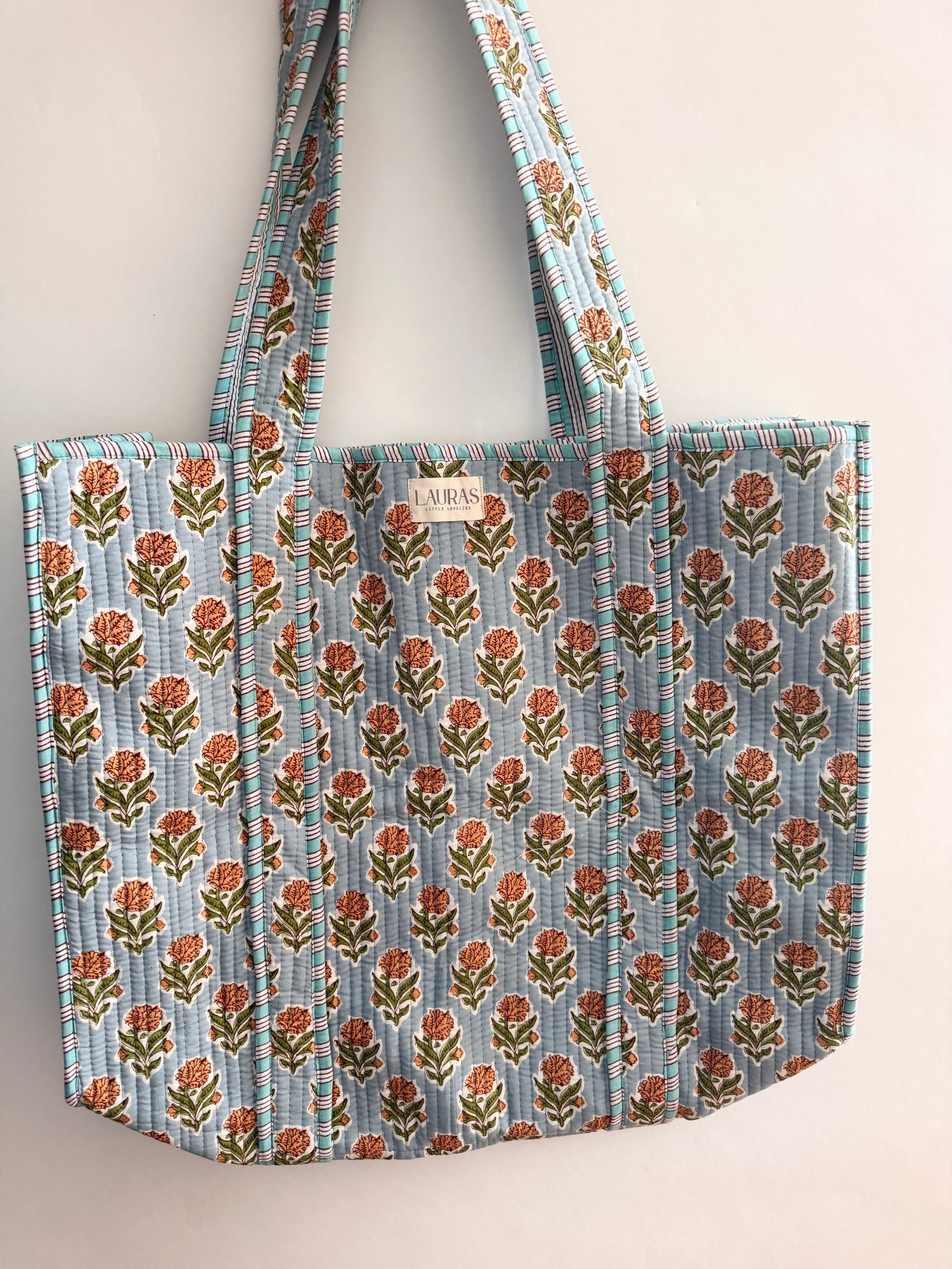 Handmade by artisans in India, these are 100% cotton block print tote bags. This is our large size tote featuring an interior pocket and two shoulder straps. The measurments are approximately 19”L x 15”H x7”W but can vary 1-2 inches as they are hand sewn.