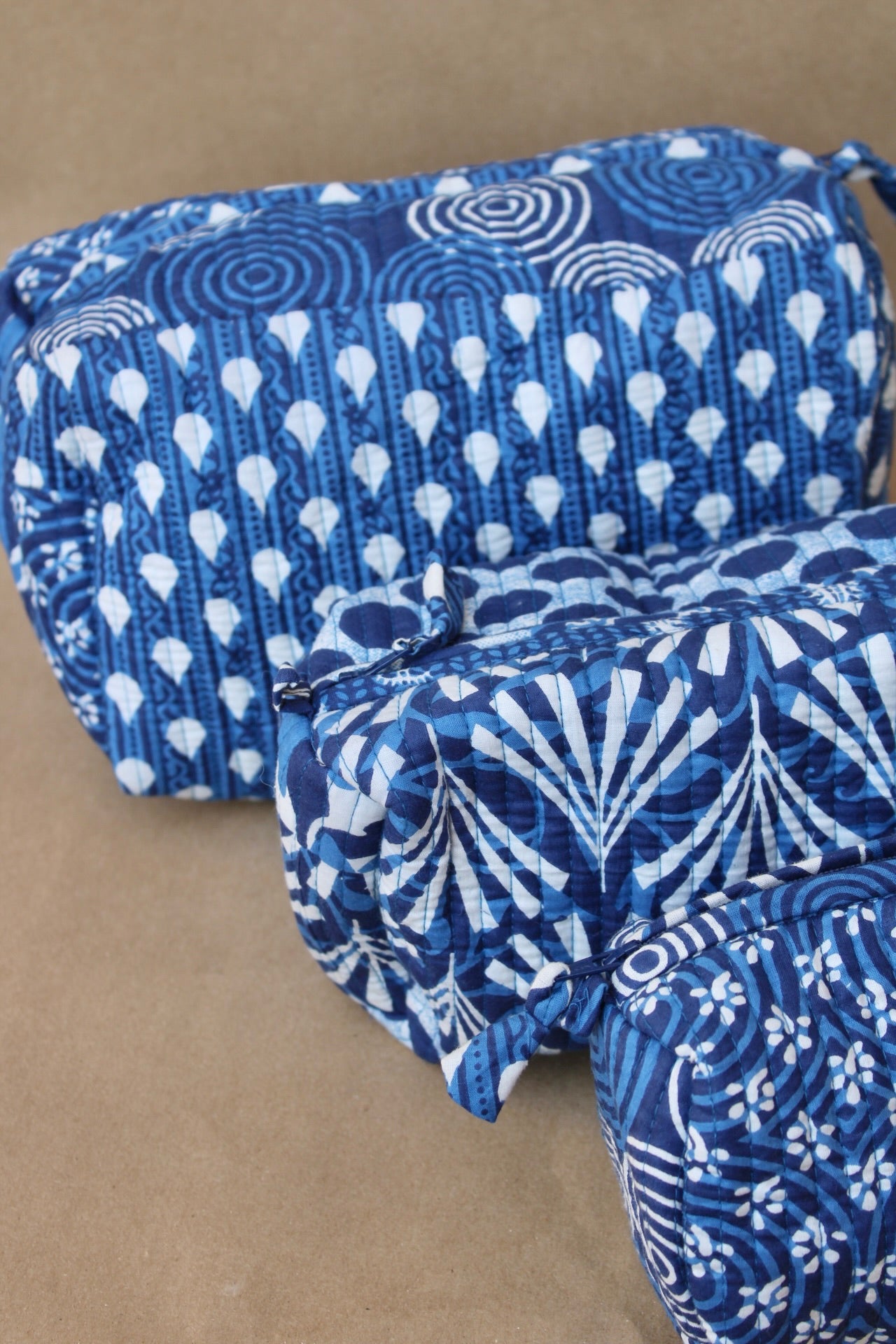 Handmade by artisans in India, these are 100% cotton block print cosmetic bags. These come as a set of 3 and include a Small, Medium, and Large. The interior is line with a wipeable, waterproof lining with several pockets.
