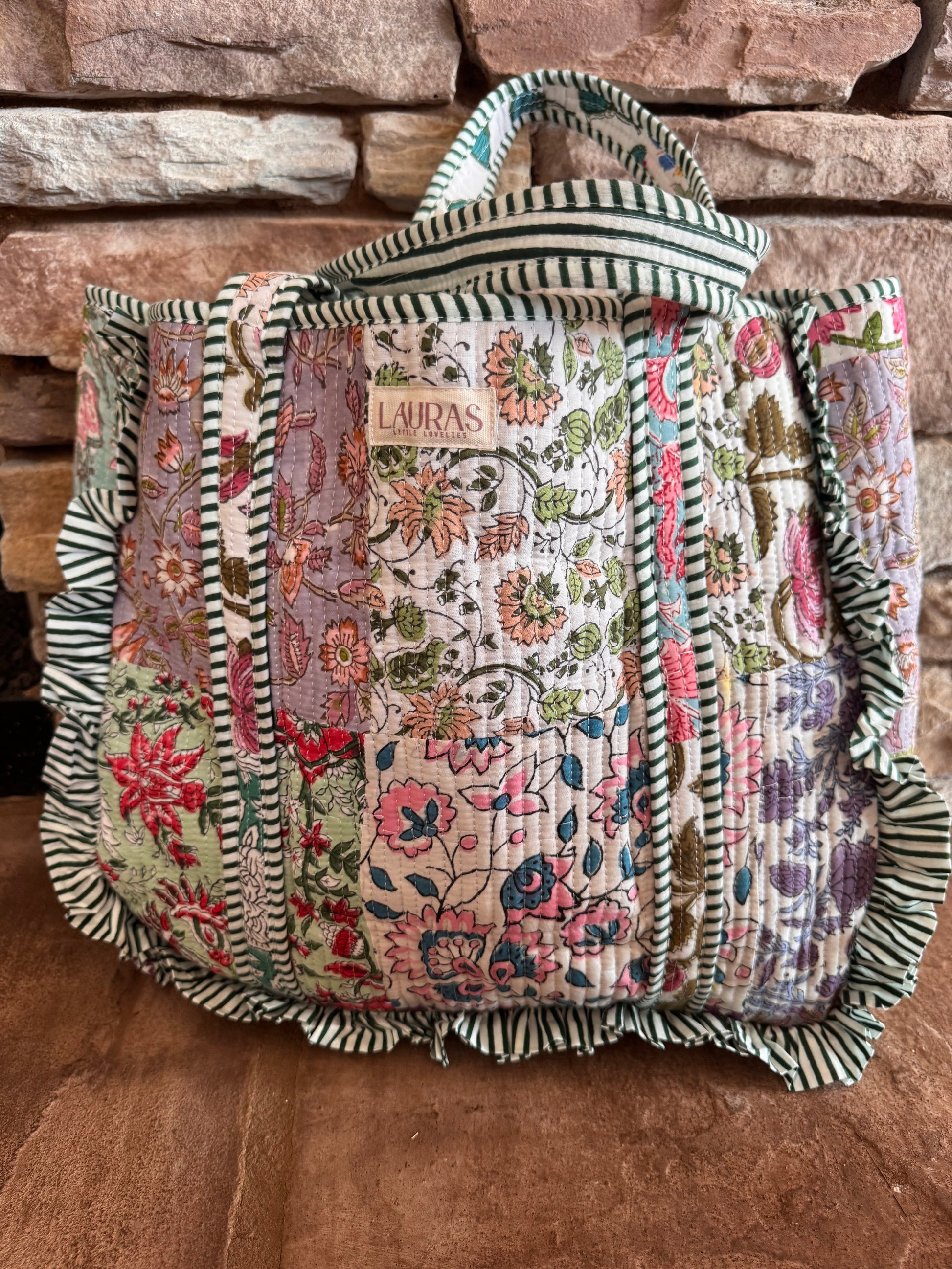 Handmade by artisans in India, these are 100% cotton block print tote bags. Posie Patch is a patchwork with multiple patterns combined to make a unique print. While all similart, these are one-of-a-kind bags. This is our ruffled edge tote featuring an interior pocket, exterior zip pocket, and two shoulder straps. The measurements are approximately 14”L x 16”H x 4”W but can vary 1-2 inches as they are hand sewn.