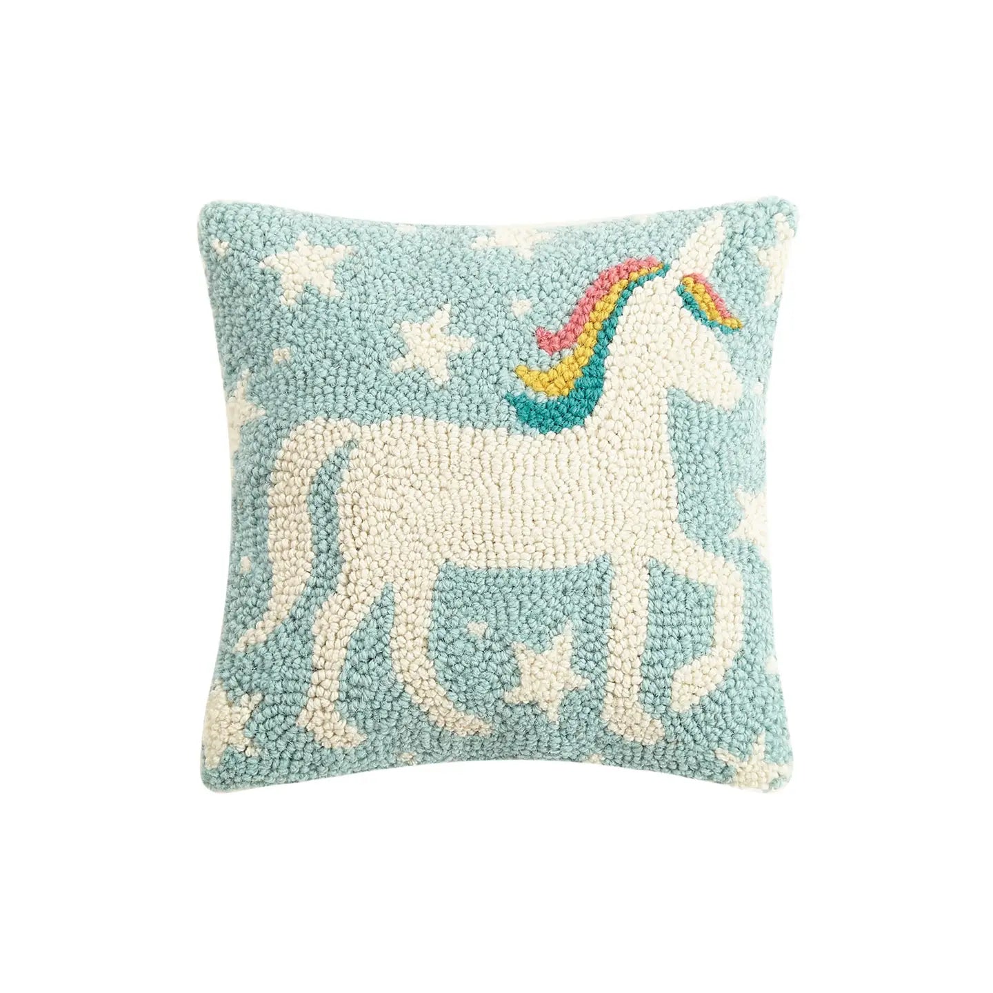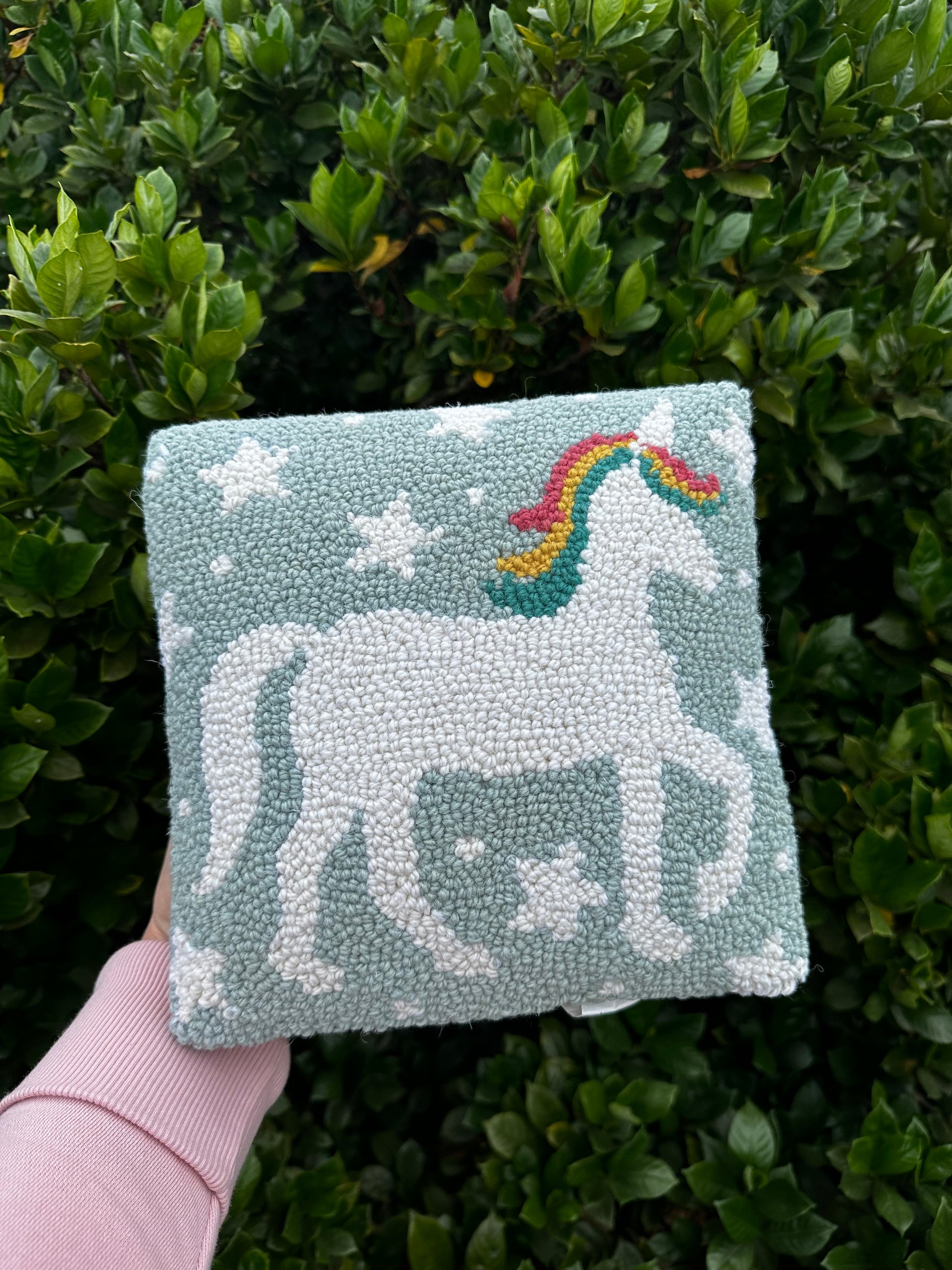 10 x 10in hand hooked throw pillow. Prefilled with a zipper enclosed insert. Ready to ship.